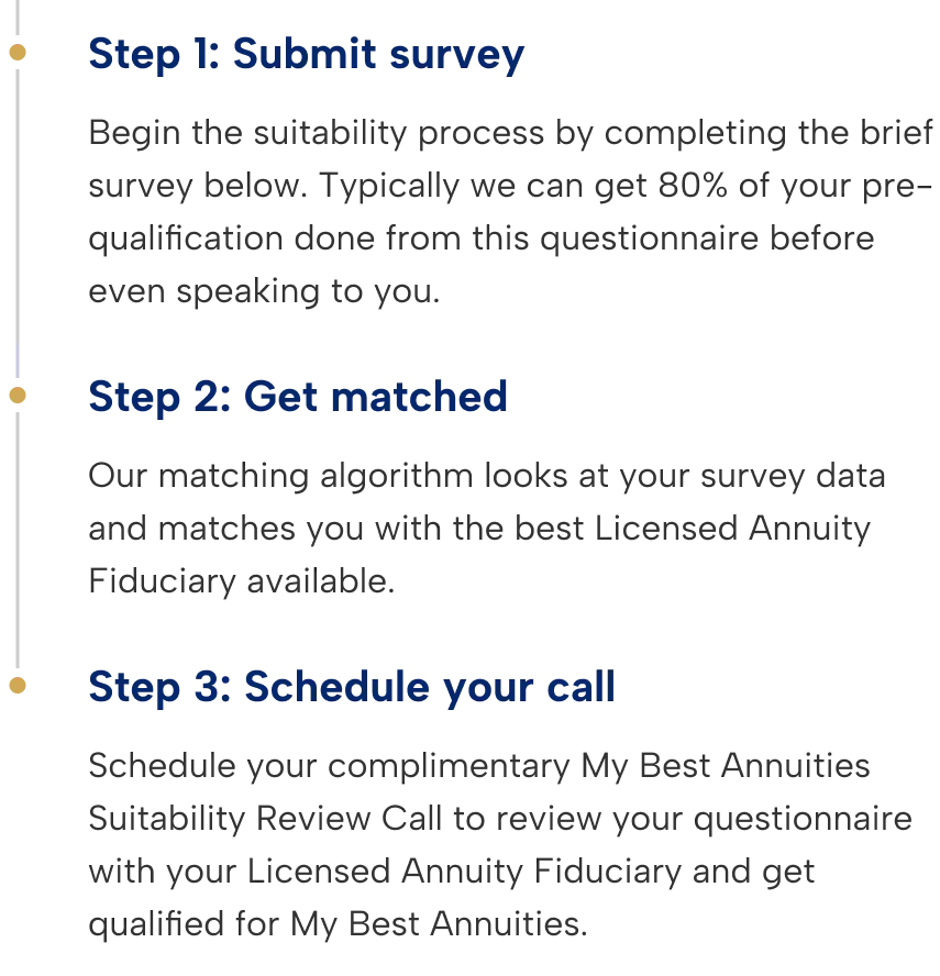 My Best Annuities is a marketing website designed to educate consumers. It does not make product recommendations. Prospects who opt-in for more information may be referred to a state-licensed insurance agent who has paid a fee to receive the referral information. These independent agents are not employees of My Best Annuities and may recommend products over which My Best Annuities has no control.